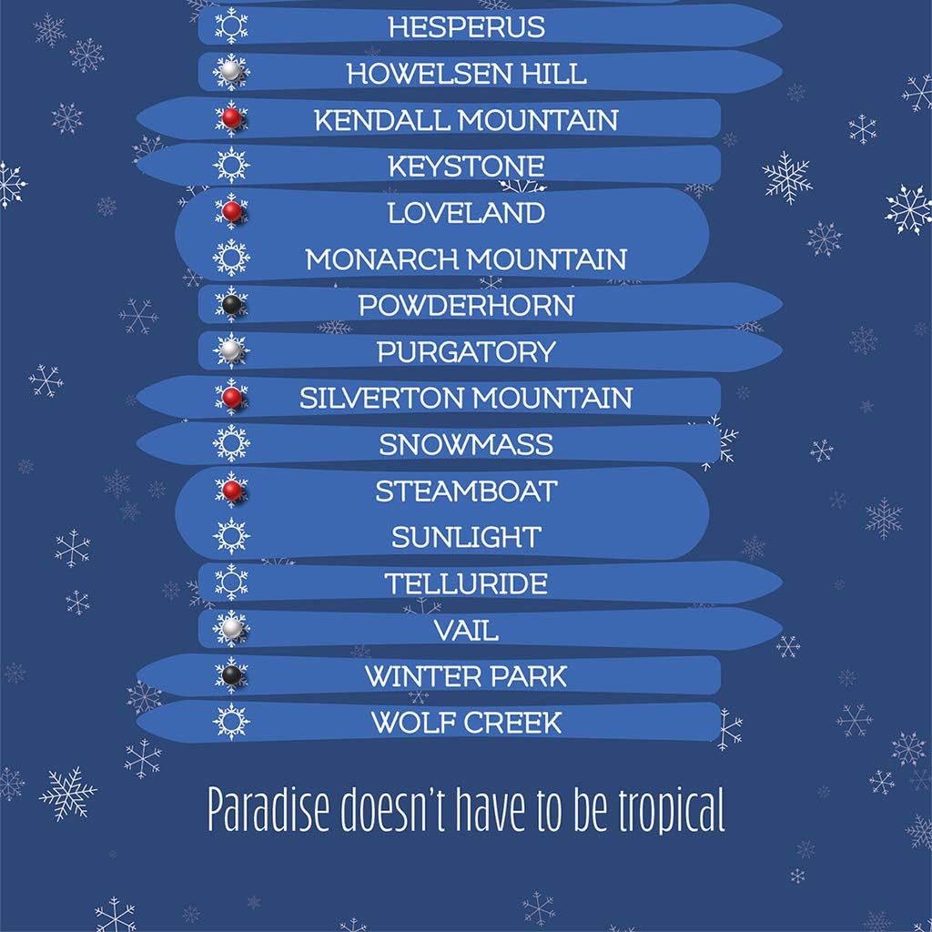 If you prefer to get your daily dose of sun on the Colorado mountain slopes then you likely agree “Paradise doesn’t have to be tropical”. Bring your ski and snowboard adventures thrill and chill indoors with our cool-toned blue mountain scene of 28 Colorado Slopes and keep track of the top-rated CO ski slopes you’ve shredded. Our alphabetized list of Colorado ski resorts makes it easy to show off your achievements in winter sports, simply pin the snowflake to the left of that resort! The vibrant blue color palette, cool ski goggles, white snowflakes, and rich canvas texture makes this artwork a great focal point for any wall, and will soon become your favorite conversation starter. Gift one to the snow baby in your life today so they can enjoy their winter blues, all year long!