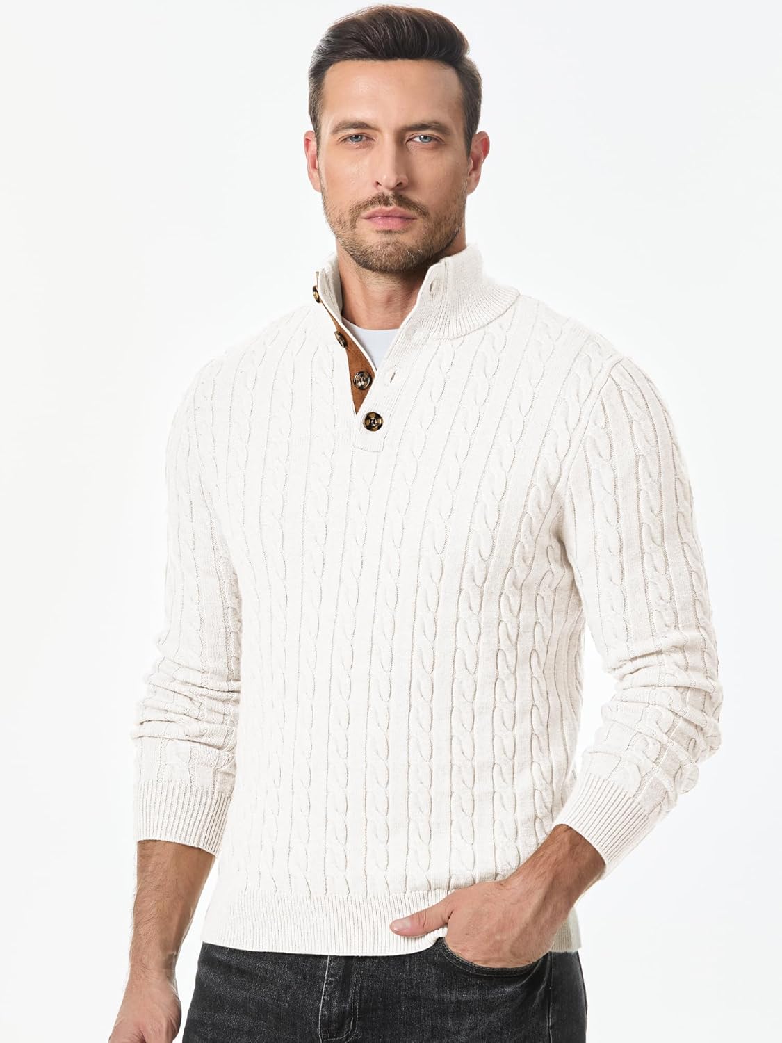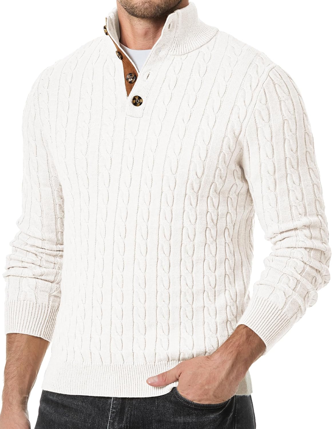 JMIERR Men’s Cable Knit Pullover Sweater Casual Long Sleeve Stand Collar Button Knitted Sweaters